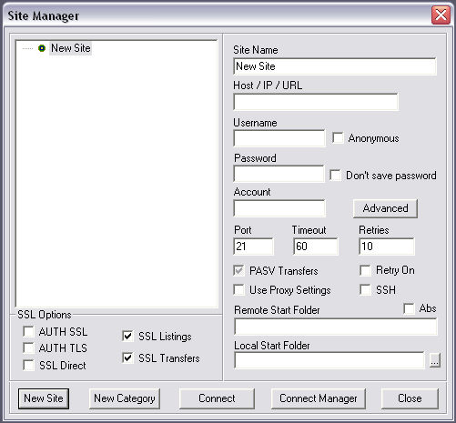 In order to connect to a FTP server, we will first set up a site in the Site Manager.