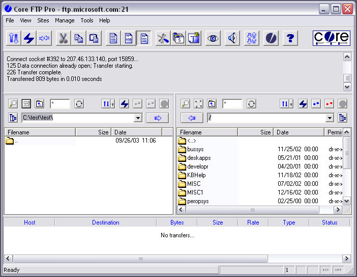 This log shows the progress of the connection being established. Remember that if you are using a dialup account, you need to already be connected to the internet. If the connection is made, the connection dialog will disappear and you should be returned to the main Core FTP screen.