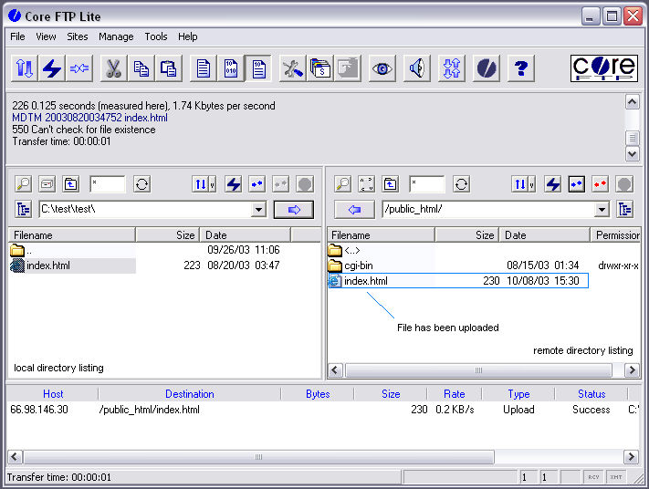 Once you have pressed the upload button, Core FTP will transfer the file to the remote server. When the transfer is complete, you should see the remote file in the remote directory listing. If the file has been uploaded to the server successfully, it can now be viewed in a web browser.