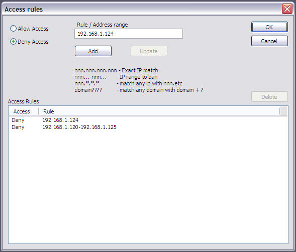 An issue that may arise during normal FTP use is that you may want to block 'problem' user who abuse your system or simply only allow a specific organization to access your server. This option will allow you to block any IP or range of IP addresses. You can alternatively block all addresses and only allow certain IP ranges to access your server.
